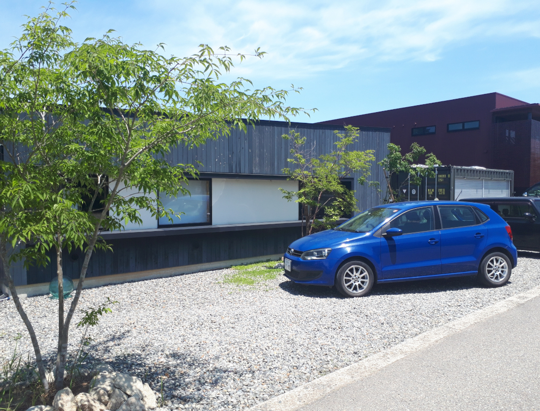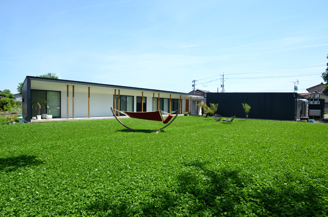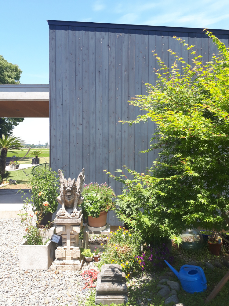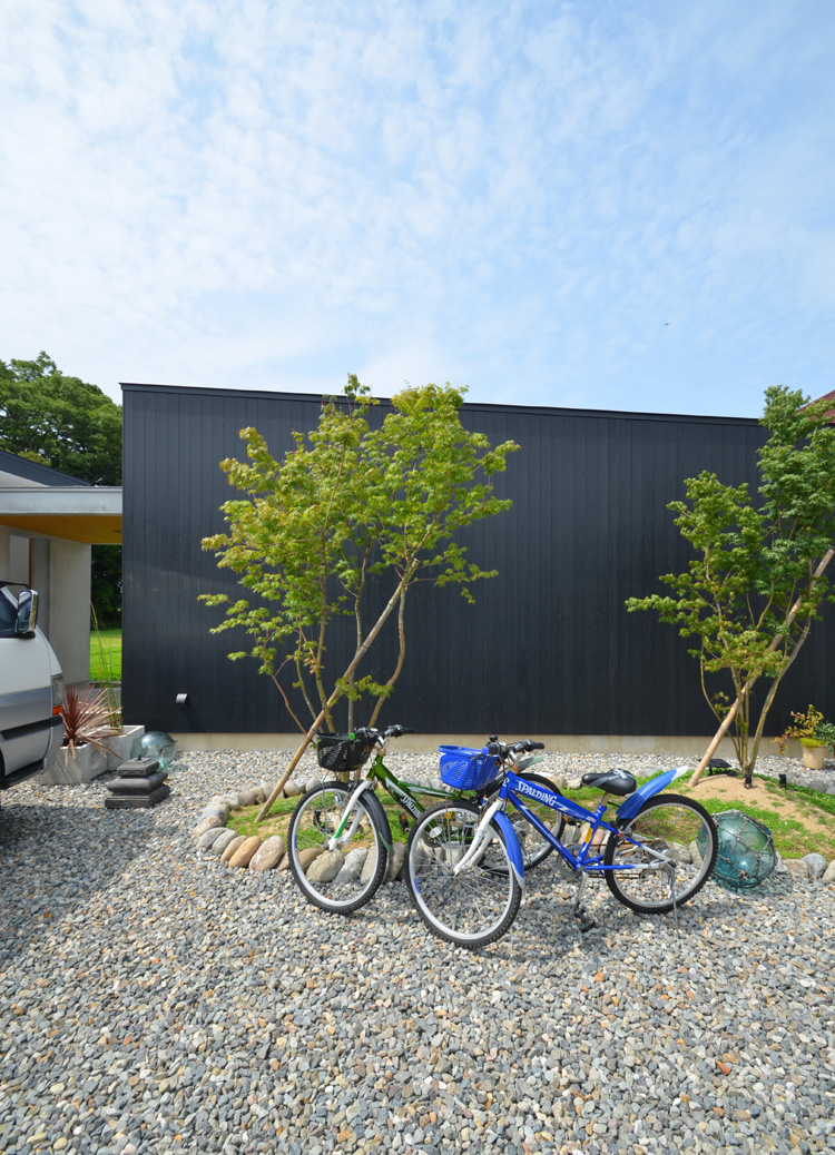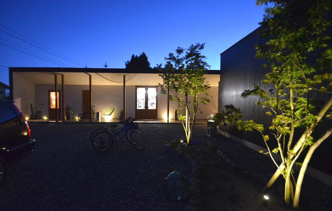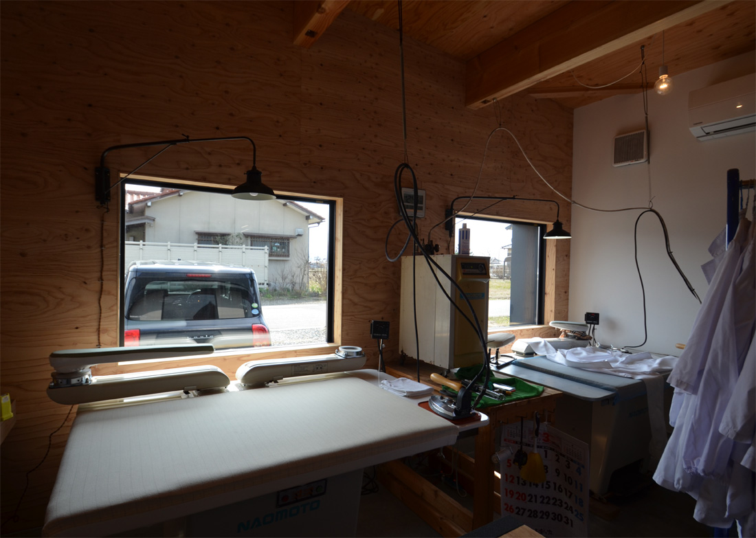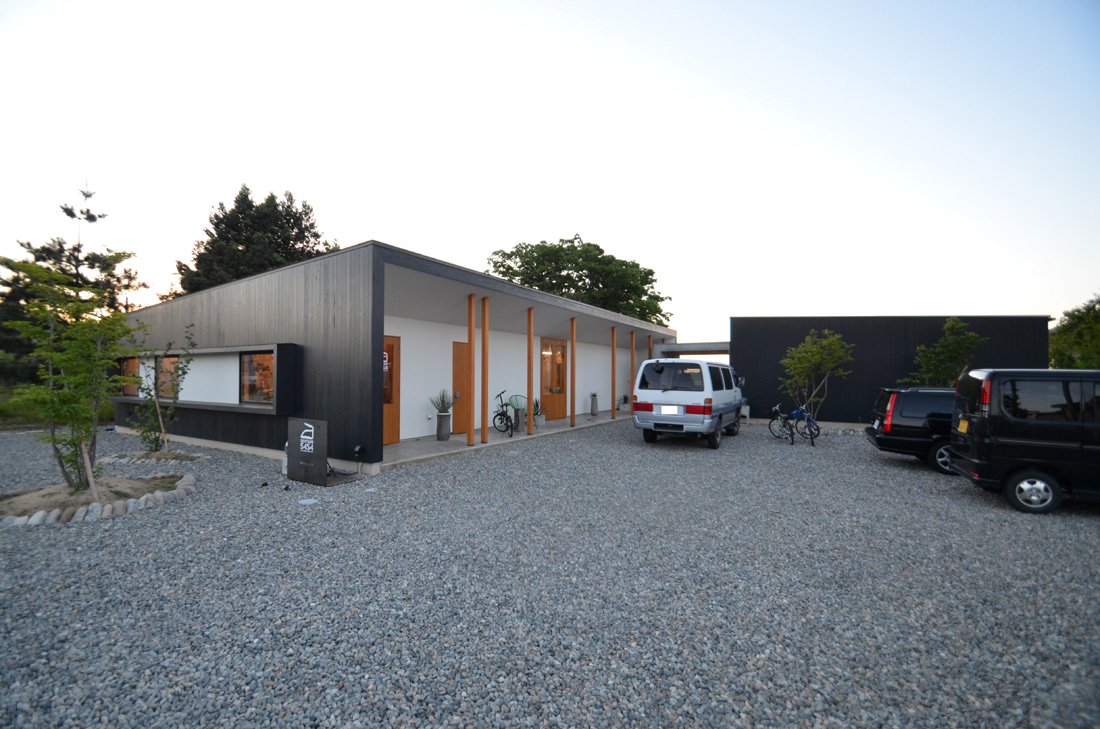 ![]() 2022.5.30 完成して五年三カ月後 ふらりとお邪魔させていただきオーナーさんと世間話m(- -)m いつもありがとうございます。 外壁がマットな焼杉のように経年変化してきました。 完成時のピカピカも好きだけど味が出る素材も好きだなー。 ![]() ![]() 2018.5.13 完成して一年半後 素敵な庭になっていました。別世界みたい。 ![]() 庭の真ん中にあるのはハンモックだよ。 ![]() 2017.6.28 夏の5454はこんな感じです。ほんと気持ちいい。 ![]() 春先に植えたマイクロクローバーが成長しました。 ![]() テラスの奥行は1.7mで軒の深さは2.0mです。 リゾート気分を味わいたいというご主人の希望を叶えるテラス。 ![]() ![]() 左にあるのが住宅棟、右にあるのがクリーニングの店舗棟。 ![]() 奥の田んぼと繋がりを感じられる裏庭。 ![]() 住宅と店舗(仕事場)を繋ぐ渡り廊下(トンネル)から裏庭を見る。 ![]() 店舗棟のテラスからトンネルを通して住宅棟のテラスを見る。 黒い外壁に合うモミジを植えてみました。 ![]() ![]() 2017.5.25 引き渡してから3カ月後 夕暮れ時の写真を撮らせていただきました。 完成後も照明、植栽、看板など住み手のこだわりが加わり、どんどんパワーアップしていく5454さんです。 ![]() ![]() ライトアップ!!日本じゃないみたいだね。 ![]() 土間仕上げのシンプルな玄関。 オリジナルでつくった横長の下駄箱。 ![]() 洗面、浴室、バスコートを見る。 仕切りはガラス戸なのでとても広く感じる。 浴槽、シャワー、水栓等はご主人がこだわってネット購入されたもの。 ![]() シナ合板と和紙クロスで仕上げたお母さんの和室。 左に見えるのがシナ合板でオリジナルでつくったテレビボード。右は仏壇を置くスペース。 ![]() 20帖のリビングダイニング。 テレビ上部には埋め込みのスクリーンボックスを設けている。 ソファの横に木魚?と思われた方もいるでしょうが実は植木鉢らしいよ! ![]() ダイニングから隣の神社を見る。 6人掛けのテーブルと照明器具はゴールデンベル×3。 ![]() トーヨーキッチンとサンワカンパニーのレンジフード。 リビングとキッチンは分けてほしいというリクエストでした。 ![]() ご夫婦の寝室。壁の凹みは壁掛けのテレビが入ります。 ![]() 合板サンドイッチ仕上げの子供部屋。 二段ベットって子供の頃あこがれたなー。 ![]() 床は荒々しい表情の土間コンクリート仕上げ。 部分的に床暖房が仕込まれている。 右手の壁は杉板張りオスモ塗装。 ![]() 壁と同材でクローゼットをつくった。 長さは6.6mで家族全員分の収納となっている。 ![]() 玄関に柔らかい光が入ってきます。 ![]() 玄関から渡り廊下(トンネル)を見る。 ![]() クリーニングの作業場には乾燥機や洗濯機などの機械が並ぶ。 蒸気の配管とストイックな仕上げがなんだかいい感じ。 ![]() アイロン台の作業風景を外の人に見てもらいたいということで窓を設けている。 ![]() 仕上がったものをストックしておく棚。 計画概要 名称:5454 計画内容:店舗(クリーニング屋)併用住宅 計画地:石川県加賀市 構造:木造平屋建て 敷地面積:1346.90u(407.43坪) 延床面積:276.33u(83.58坪) 建築面積:361.32u(109.29坪) 設計期間:2015.10〜2016.3 工事期間:2016.4〜2017.1 撮影:稲森予人 〜ここからは施工中の写真〜 ![]() モミジ、アオハダ、アオダモ、ダンコウバイ、マルバノキ、ナツハゼなどの10本の木をクライアント、監督、植栽屋さんと話し合いながら配置決め。 やっぱり木の力はすごいね。置いた途端に外観の重心がぐっと下がって家が地に着いた感じ。 これからクライアントが徐々に下草を植えていかれるとのことなんだけどより楽しみだ。 植栽計画悩んでよかったー。 ![]() クリーニング機器の排気口が黒の外壁に合うね。 ![]() エアコン室外機、エコキュート、床暖房のヒートポンプなどをまとめて配置。 家の裏側だけどかっこつけてみました。 ![]() クリーニング設備機器搬入中 ![]() ![]() ![]() ![]() ![]() ![]() ![]() 寒い。。。 ![]() クリーニング作業場はもう一息。 ![]() クライアントと監督と一緒に照明の設置高さなどを現場で確認しました。 寒い中ありがとうございました。 これから設備機器と建具と照明器具などなど色々入ってきて嬉しいことの連続です。現場が楽しみだ。 ![]() クロス張り工事も終わりました。ここのお家はすごく明るいです。 このプロジェクトもあとちょっとで終わっちゃうんだなぁ。。。寂しくなるなぁ。 ![]() 作業場の観音開き扉は木製のかんぬき錠を使っています。 昔ながらの施錠方法がなんだかとてもステキです。建具屋さん監督さんありがとう。 ![]() 僕がこの家の子なら朝から晩までここでサッカーかバスケするだろうなー。 ![]() トンネルはトンネルらしくモルタル塗り仕上げ。 ![]() 足場がバラされましたー。 ![]() 大工さんががんばっていた板張りの出隅部分45度トメ加工が美しい。すごすぎ。 ![]() 大工さんがイナバウアー状態になるまで板張りがんばってくれています。感謝感謝。 もうこのプロジェクトも大工さんとはお別れだ。挨拶をしっかりしなければ。 ![]