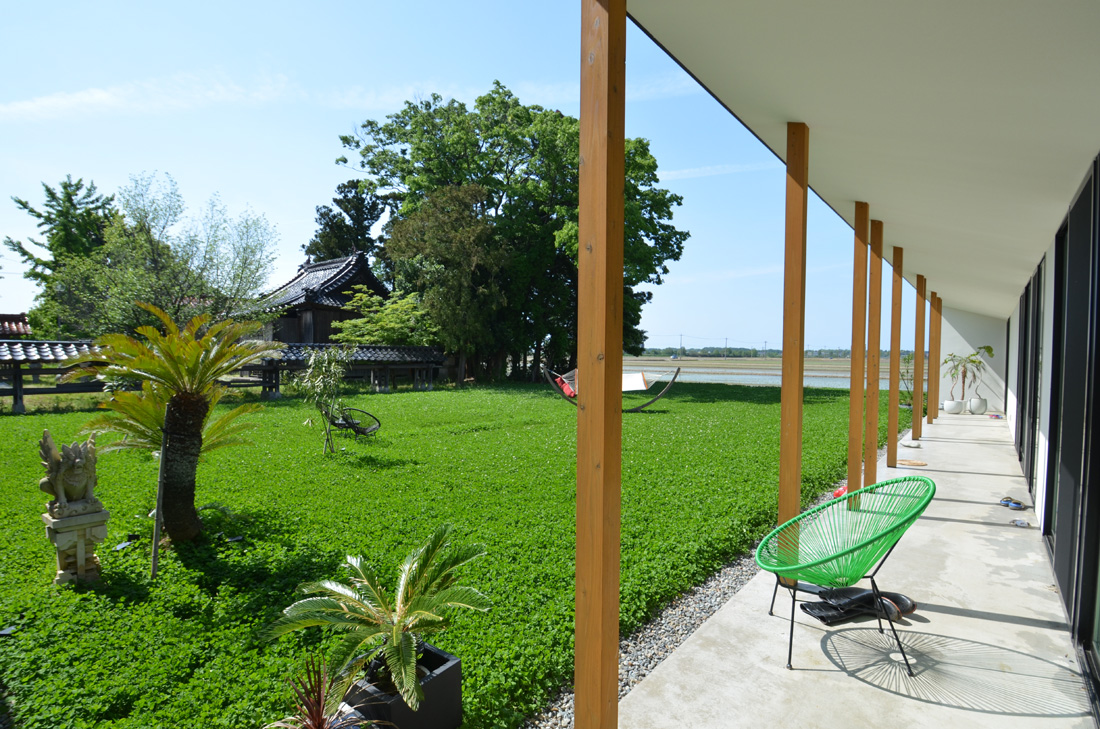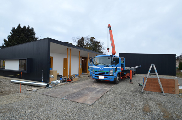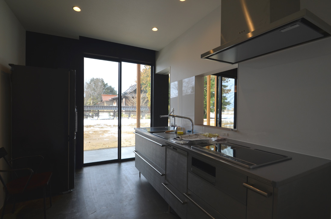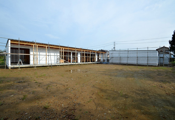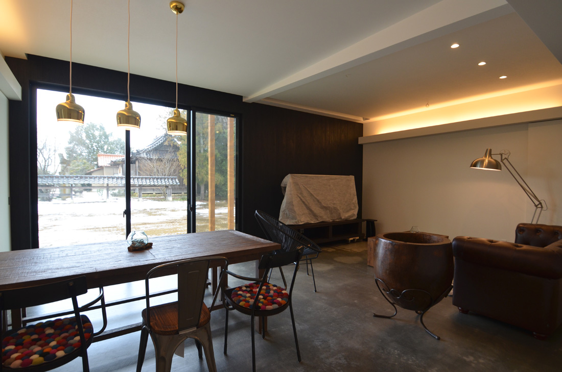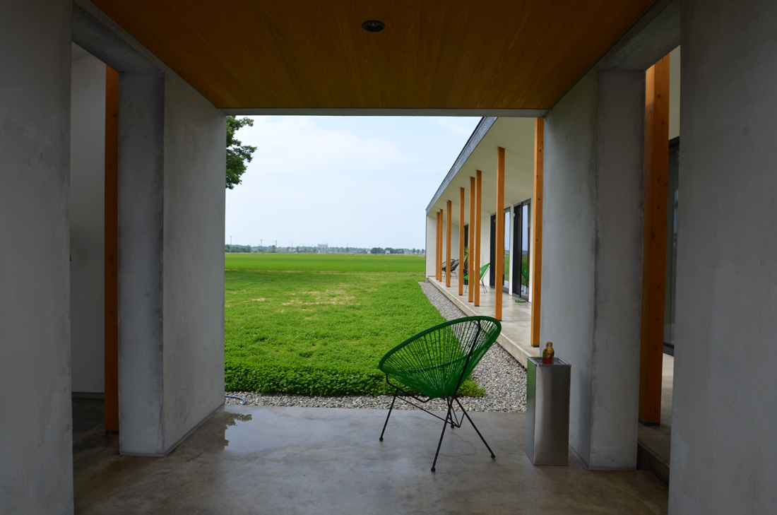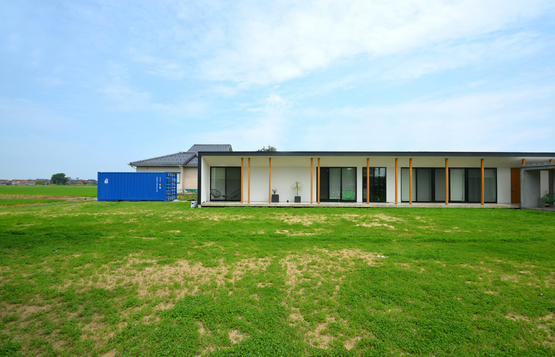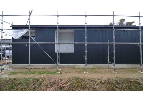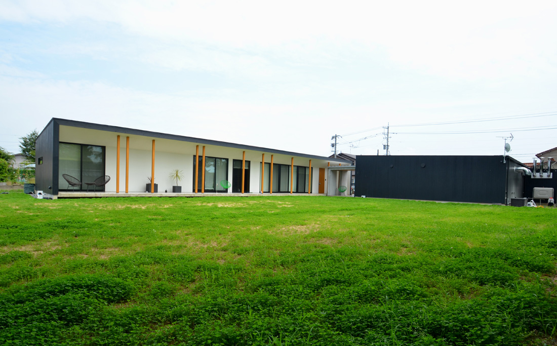 ![]() 2022.5.30 完成して五年三カ月後 ふらりとお邪魔させていただきオーナーさんと世間話m(- -)m いつもありがとうございます。 外壁がマットな焼杉のように経年変化してきました。 完成時のピカピカも好きだけど味が出る素材も好きだなー。 ![]() ![]() 2018.5.13 完成して一年半後 素敵な庭になっていました。別世界みたい。 ![]() 庭の真ん中にあるのはハンモックだよ。 ![]() 2017.6.28 夏の5454はこんな感じです。ほんと気持ちいい。 ![]() 春先に植えたマイクロクローバーが成長しました。 ![]() テラスの奥行は1.7mで軒の深さは2.0mです。 リゾート気分を味わいたいというご主人の希望を叶えるテラス。 ![]() ![]() 左にあるのが住宅棟、右にあるのがクリーニングの店舗棟。 ![]() 奥の田んぼと繋がりを感じられる裏庭。 ![]() 住宅と店舗(仕事場)を繋ぐ渡り廊下(トンネル)から裏庭を見る。 ![]() 店舗棟のテラスからトンネルを通して住宅棟のテラスを見る。 黒い外壁に合うモミジを植えてみました。 ![]() ![]() 2017.5.25 引き渡してから3カ月後 夕暮れ時の写真を撮らせていただきました。 完成後も照明、植栽、看板など住み手のこだわりが加わり、どんどんパワーアップしていく5454さんです。 ![]() ![]() ライトアップ!!日本じゃないみたいだね。 ![]() 土間仕上げのシンプルな玄関。 オリジナルでつくった横長の下駄箱。 ![]() 洗面、浴室、バスコートを見る。 仕切りはガラス戸なのでとても広く感じる。 浴槽、シャワー、水栓等はご主人がこだわってネット購入されたもの。 ![]() シナ合板と和紙クロスで仕上げたお母さんの和室。 左に見えるのがシナ合板でオリジナルでつくったテレビボード。右は仏壇を置くスペース。 ![]() 20帖のリビングダイニング。 テレビ上部には埋め込みのスクリーンボックスを設けている。 ソファの横に木魚?と思われた方もいるでしょうが実は植木鉢らしいよ! ![]() ダイニングから隣の神社を見る。 6人掛けのテーブルと照明器具はゴールデンベル×3。 ![]() トーヨーキッチンとサンワカンパニーのレンジフード。 リビングとキッチンは分けてほしいというリクエストでした。 ![]() ご夫婦の寝室。壁の凹みは壁掛けのテレビが入ります。 ![]() 合板サンドイッチ仕上げの子供部屋。 二段ベットって子供の頃あこがれたなー。 ![]() 床は荒々しい表情の土間コンクリート仕上げ。 部分的に床暖房が仕込まれている。 右手の壁は杉板張りオスモ塗装。 ![]() 壁と同材でクローゼットをつくった。 長さは6.6mで家族全員分の収納となっている。 ![]() 玄関に柔らかい光が入ってきます。 ![]() 玄関から渡り廊下(トンネル)を見る。 ![]() クリーニングの作業場には乾燥機や洗濯機などの機械が並ぶ。 蒸気の配管とストイックな仕上げがなんだかいい感じ。 ![]() アイロン台の作業風景を外の人に見てもらいたいということで窓を設けている。 ![]() 仕上がったものをストックしておく棚。 計画概要 名称:5454 計画内容:店舗(クリーニング屋)併用住宅 計画地:石川県加賀市 構造:木造平屋建て 敷地面積:1346.90u(407.43坪) 延床面積:276.33u(83.58坪) 建築面積:361.32u(109.29坪) 設計期間:2015.10〜2016.3 工事期間:2016.4〜2017.1 撮影:稲森予人 〜ここからは施工中の写真〜 ![]() モミジ、アオハダ、アオダモ、ダンコウバイ、マルバノキ、ナツハゼなどの10本の木をクライアント、監督、植栽屋さんと話し合いながら配置決め。 やっぱり木の力はすごいね。置いた途端に外観の重心がぐっと下がって家が地に着いた感じ。 これからクライアントが徐々に下草を植えていかれるとのことなんだけどより楽しみだ。 植栽計画悩んでよかったー。 ![]() クリーニング機器の排気口が黒の外壁に合うね。 ![]() エアコン室外機、エコキュート、床暖房のヒートポンプなどをまとめて配置。 家の裏側だけどかっこつけてみました。 ![]() クリーニング設備機器搬入中 ![]() ![]() ![]() ![]() ![]() ![]() ![]() 寒い。。。 ![]() クリーニング作業場はもう一息。 ![]() クライアントと監督と一緒に照明の設置高さなどを現場で確認しました。 寒い中ありがとうございました。 これから設備機器と建具と照明器具などなど色々入ってきて嬉しいことの連続です。現場が楽しみだ。 ![]() クロス張り工事も終わりました。ここのお家はすごく明るいです。 このプロジェクトもあとちょっとで終わっちゃうんだなぁ。。。寂しくなるなぁ。 ![]() 作業場の観音開き扉は木製のかんぬき錠を使っています。 昔ながらの施錠方法がなんだかとてもステキです。建具屋さん監督さんありがとう。 ![]() 僕がこの家の子なら朝から晩までここでサッカーかバスケするだろうなー。 ![]() トンネルはトンネルらしくモルタル塗り仕上げ。 ![]() 足場がバラされましたー。 ![]() 大工さんががんばっていた板張りの出隅部分45度トメ加工が美しい。すごすぎ。 ![]() 大工さんがイナバウアー状態になるまで板張りがんばってくれています。感謝感謝。 もうこのプロジェクトも大工さんとはお別れだ。挨拶をしっかりしなければ。 ![]