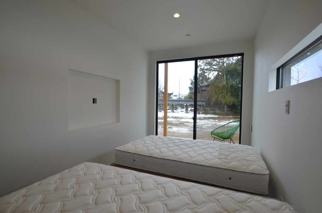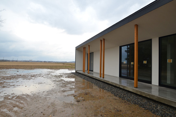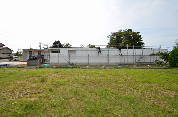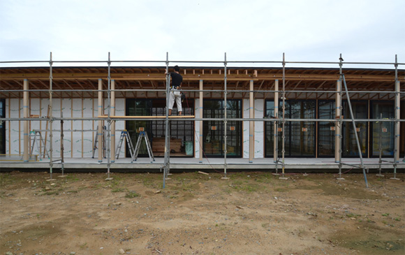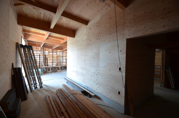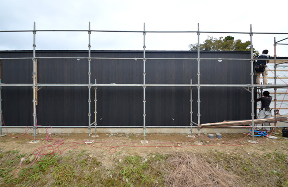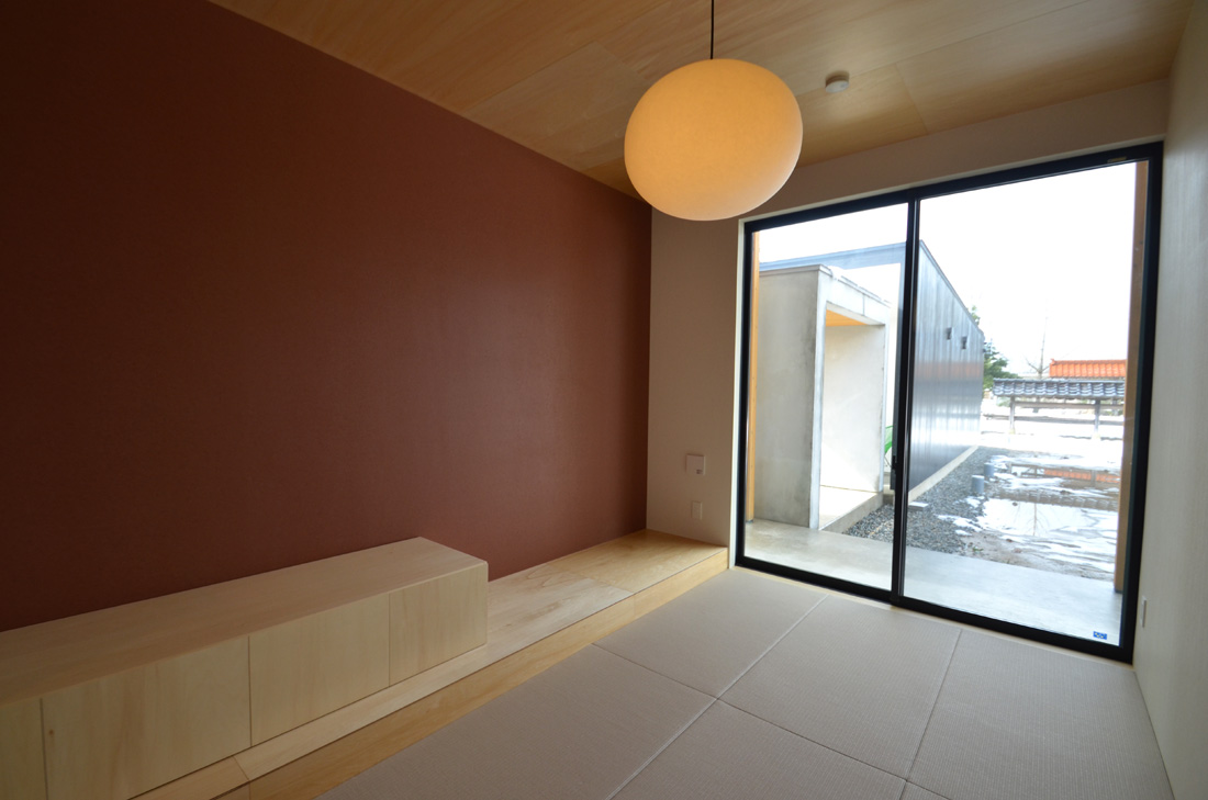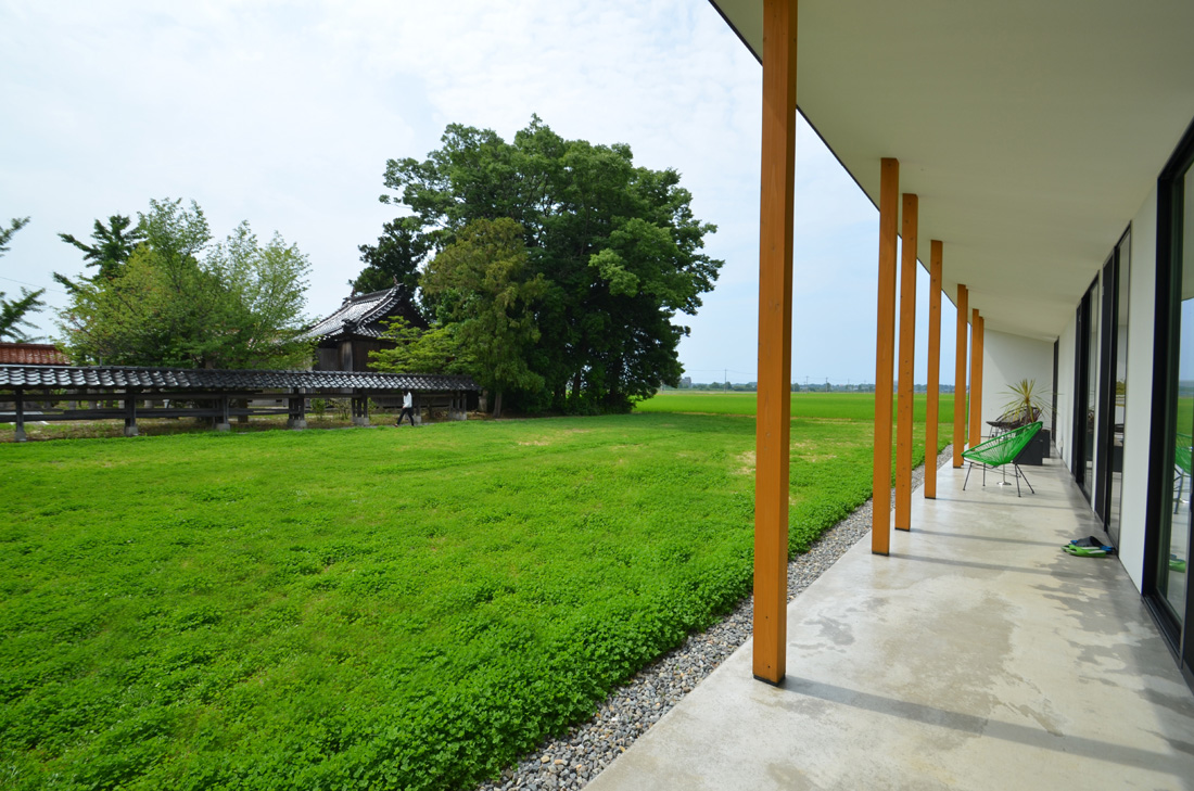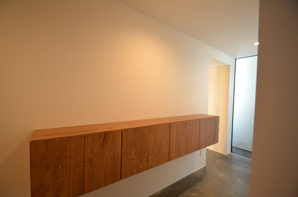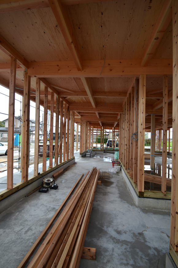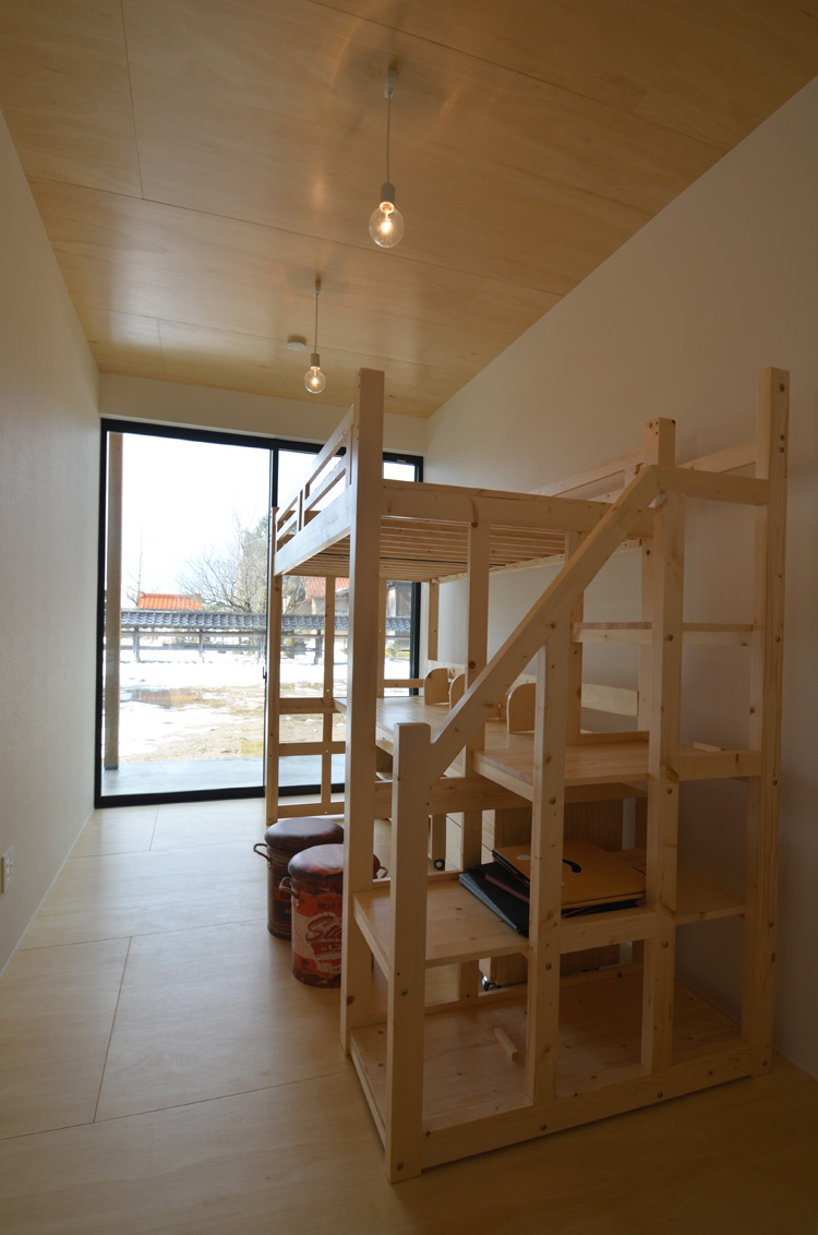 ![]() 2022.5.30 完成して五年三カ月後 ふらりとお邪魔させていただきオーナーさんと世間話m(- -)m いつもありがとうございます。 外壁がマットな焼杉のように経年変化してきました。 完成時のピカピカも好きだけど味が出る素材も好きだなー。 ![]() ![]() 2018.5.13 完成して一年半後 素敵な庭になっていました。別世界みたい。 ![]() 庭の真ん中にあるのはハンモックだよ。 ![]() 2017.6.28 夏の5454はこんな感じです。ほんと気持ちいい。 ![]() 春先に植えたマイクロクローバーが成長しました。 ![]() テラスの奥行は1.7mで軒の深さは2.0mです。 リゾート気分を味わいたいというご主人の希望を叶えるテラス。 ![]() ![]() 左にあるのが住宅棟、右にあるのがクリーニングの店舗棟。 ![]() 奥の田んぼと繋がりを感じられる裏庭。 ![]() 住宅と店舗(仕事場)を繋ぐ渡り廊下(トンネル)から裏庭を見る。 ![]() 店舗棟のテラスからトンネルを通して住宅棟のテラスを見る。 黒い外壁に合うモミジを植えてみました。 ![]() ![]() 2017.5.25 引き渡してから3カ月後 夕暮れ時の写真を撮らせていただきました。 完成後も照明、植栽、看板など住み手のこだわりが加わり、どんどんパワーアップしていく5454さんです。 ![]() ![]() ライトアップ!!日本じゃないみたいだね。 ![]() 土間仕上げのシンプルな玄関。 オリジナルでつくった横長の下駄箱。 ![]() 洗面、浴室、バスコートを見る。 仕切りはガラス戸なのでとても広く感じる。 浴槽、シャワー、水栓等はご主人がこだわってネット購入されたもの。 ![]() シナ合板と和紙クロスで仕上げたお母さんの和室。 左に見えるのがシナ合板でオリジナルでつくったテレビボード。右は仏壇を置くスペース。 ![]() 20帖のリビングダイニング。 テレビ上部には埋め込みのスクリーンボックスを設けている。 ソファの横に木魚?と思われた方もいるでしょうが実は植木鉢らしいよ! ![]() ダイニングから隣の神社を見る。 6人掛けのテーブルと照明器具はゴールデンベル×3。 ![]() トーヨーキッチンとサンワカンパニーのレンジフード。 リビングとキッチンは分けてほしいというリクエストでした。 ![]() ご夫婦の寝室。壁の凹みは壁掛けのテレビが入ります。 ![]() 合板サンドイッチ仕上げの子供部屋。 二段ベットって子供の頃あこがれたなー。 ![]() 床は荒々しい表情の土間コンクリート仕上げ。 部分的に床暖房が仕込まれている。 右手の壁は杉板張りオスモ塗装。 ![]() 壁と同材でクローゼットをつくった。 長さは6.6mで家族全員分の収納となっている。 ![]() 玄関に柔らかい光が入ってきます。 ![]() 玄関から渡り廊下(トンネル)を見る。 ![]() クリーニングの作業場には乾燥機や洗濯機などの機械が並ぶ。 蒸気の配管とストイックな仕上げがなんだかいい感じ。 ![]() アイロン台の作業風景を外の人に見てもらいたいということで窓を設けている。 ![]() 仕上がったものをストックしておく棚。 計画概要 名称:5454 計画内容:店舗(クリーニング屋)併用住宅 計画地:石川県加賀市 構造:木造平屋建て 敷地面積:1346.90u(407.43坪) 延床面積:276.33u(83.58坪) 建築面積:361.32u(109.29坪) 設計期間:2015.10〜2016.3 工事期間:2016.4〜2017.1 撮影:稲森予人 〜ここからは施工中の写真〜 ![]() モミジ、アオハダ、アオダモ、ダンコウバイ、マルバノキ、ナツハゼなどの10本の木をクライアント、監督、植栽屋さんと話し合いながら配置決め。 やっぱり木の力はすごいね。置いた途端に外観の重心がぐっと下がって家が地に着いた感じ。 これからクライアントが徐々に下草を植えていかれるとのことなんだけどより楽しみだ。 植栽計画悩んでよかったー。 ![]() クリーニング機器の排気口が黒の外壁に合うね。 ![]() エアコン室外機、エコキュート、床暖房のヒートポンプなどをまとめて配置。 家の裏側だけどかっこつけてみました。 ![]() クリーニング設備機器搬入中 ![]() ![]() ![]() ![]() ![]() ![]() ![]() 寒い。。。 ![]() クリーニング作業場はもう一息。 ![]() クライアントと監督と一緒に照明の設置高さなどを現場で確認しました。 寒い中ありがとうございました。 これから設備機器と建具と照明器具などなど色々入ってきて嬉しいことの連続です。現場が楽しみだ。 ![]() クロス張り工事も終わりました。ここのお家はすごく明るいです。 このプロジェクトもあとちょっとで終わっちゃうんだなぁ。。。寂しくなるなぁ。 ![]() 作業場の観音開き扉は木製のかんぬき錠を使っています。 昔ながらの施錠方法がなんだかとてもステキです。建具屋さん監督さんありがとう。 ![]() 僕がこの家の子なら朝から晩までここでサッカーかバスケするだろうなー。 ![]() トンネルはトンネルらしくモルタル塗り仕上げ。 ![]() 足場がバラされましたー。 ![]() 大工さんががんばっていた板張りの出隅部分45度トメ加工が美しい。すごすぎ。 ![]() 大工さんがイナバウアー状態になるまで板張りがんばってくれています。感謝感謝。 もうこのプロジェクトも大工さんとはお別れだ。挨拶をしっかりしなければ。 ![]