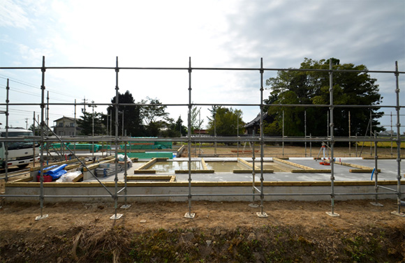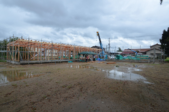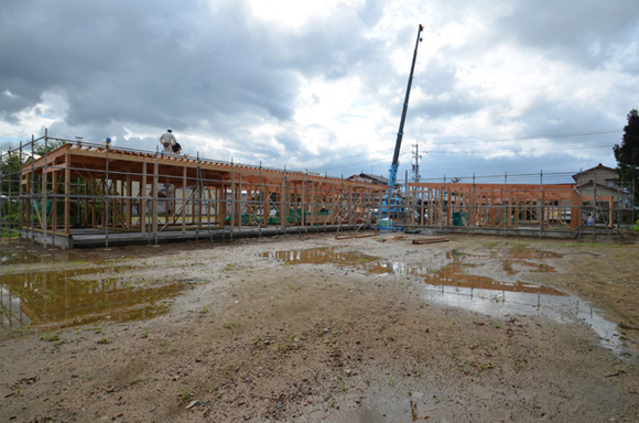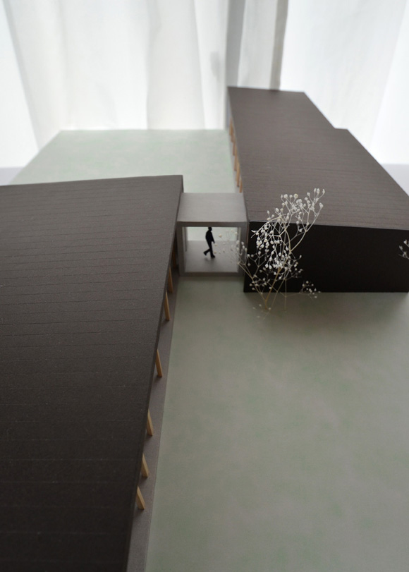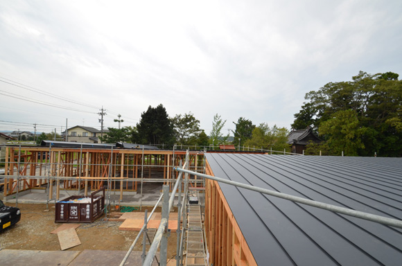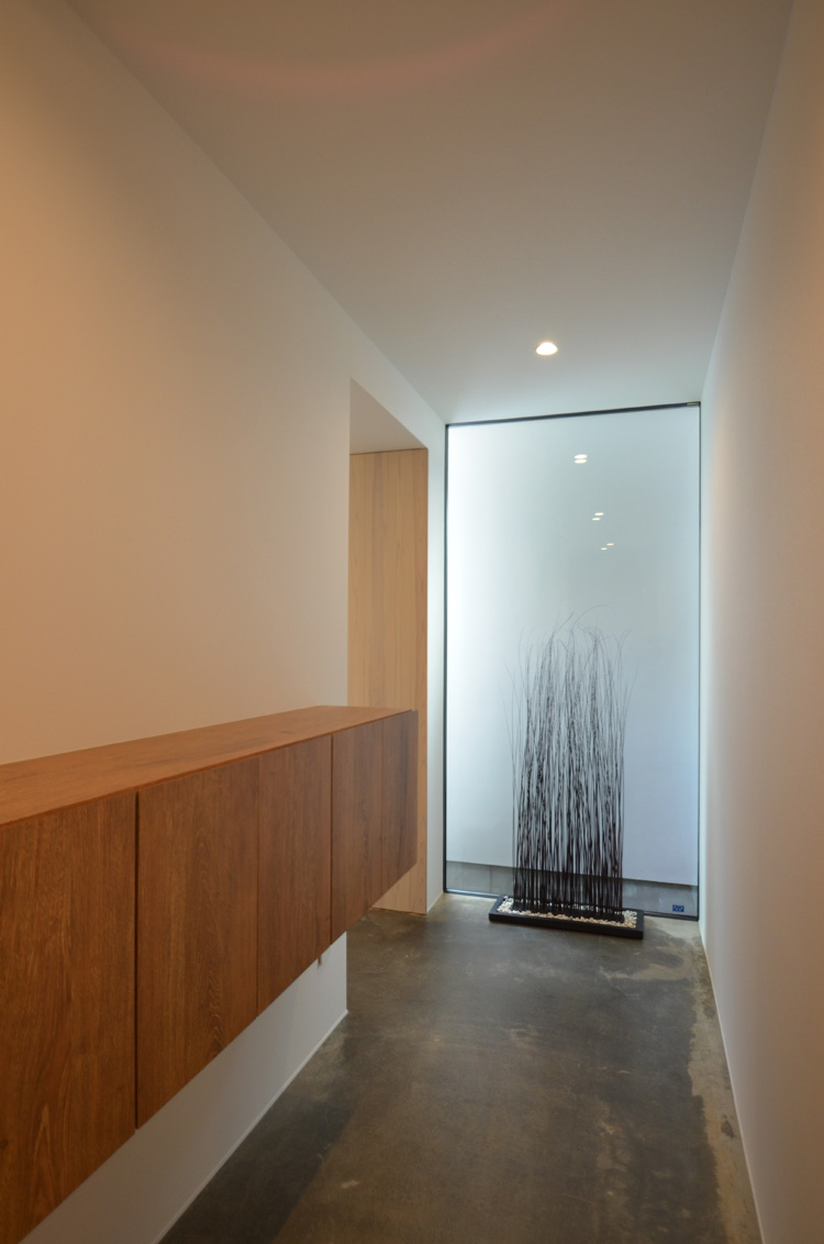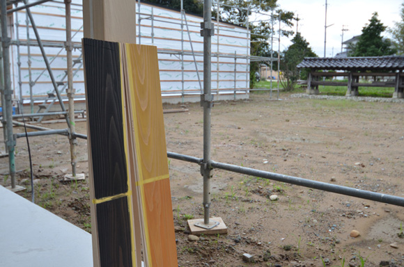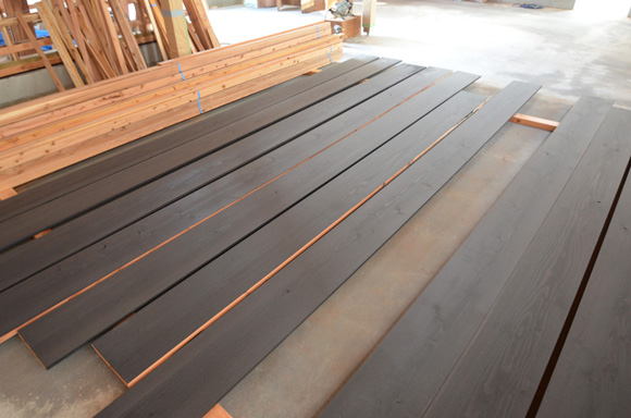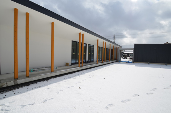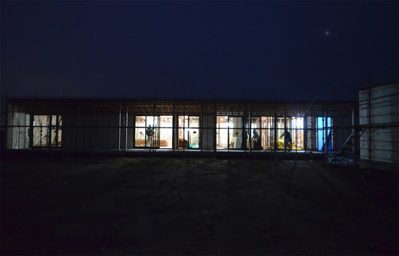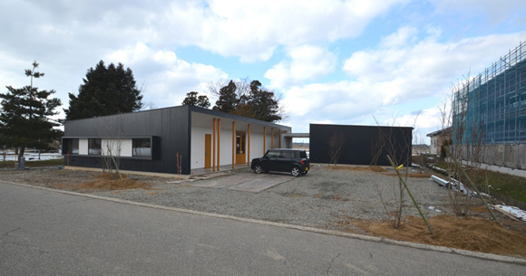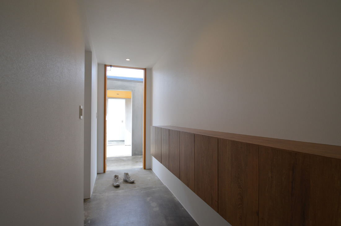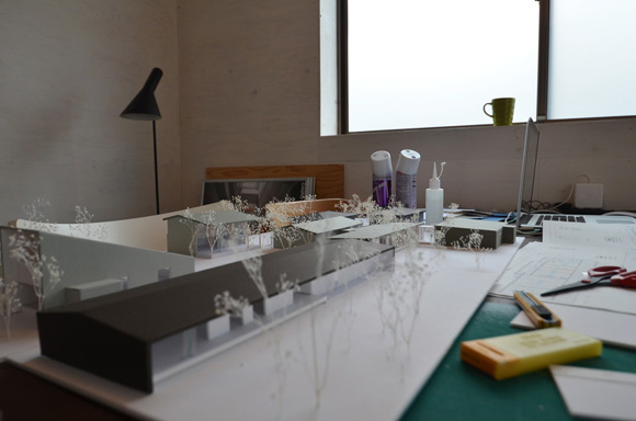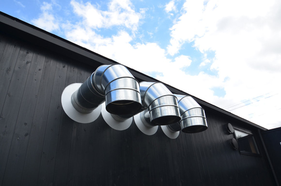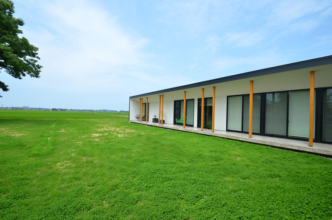 ![]() 2022.5.30 完成して五年三カ月後 ふらりとお邪魔させていただきオーナーさんと世間話m(- -)m いつもありがとうございます。 外壁がマットな焼杉のように経年変化してきました。 完成時のピカピカも好きだけど味が出る素材も好きだなー。 ![]() ![]() 2018.5.13 完成して一年半後 素敵な庭になっていました。別世界みたい。 ![]() 庭の真ん中にあるのはハンモックだよ。 ![]() 2017.6.28 夏の5454はこんな感じです。ほんと気持ちいい。 ![]() 春先に植えたマイクロクローバーが成長しました。 ![]() テラスの奥行は1.7mで軒の深さは2.0mです。 リゾート気分を味わいたいというご主人の希望を叶えるテラス。 ![]() ![]() 左にあるのが住宅棟、右にあるのがクリーニングの店舗棟。 ![]() 奥の田んぼと繋がりを感じられる裏庭。 ![]() 住宅と店舗(仕事場)を繋ぐ渡り廊下(トンネル)から裏庭を見る。 ![]() 店舗棟のテラスからトンネルを通して住宅棟のテラスを見る。 黒い外壁に合うモミジを植えてみました。 ![]() ![]() 2017.5.25 引き渡してから3カ月後 夕暮れ時の写真を撮らせていただきました。 完成後も照明、植栽、看板など住み手のこだわりが加わり、どんどんパワーアップしていく5454さんです。 ![]() ![]() ライトアップ!!日本じゃないみたいだね。 ![]() 土間仕上げのシンプルな玄関。 オリジナルでつくった横長の下駄箱。 ![]() 洗面、浴室、バスコートを見る。 仕切りはガラス戸なのでとても広く感じる。 浴槽、シャワー、水栓等はご主人がこだわってネット購入されたもの。 ![]() シナ合板と和紙クロスで仕上げたお母さんの和室。 左に見えるのがシナ合板でオリジナルでつくったテレビボード。右は仏壇を置くスペース。 ![]() 20帖のリビングダイニング。 テレビ上部には埋め込みのスクリーンボックスを設けている。 ソファの横に木魚?と思われた方もいるでしょうが実は植木鉢らしいよ! ![]() ダイニングから隣の神社を見る。 6人掛けのテーブルと照明器具はゴールデンベル×3。 ![]() トーヨーキッチンとサンワカンパニーのレンジフード。 リビングとキッチンは分けてほしいというリクエストでした。 ![]() ご夫婦の寝室。壁の凹みは壁掛けのテレビが入ります。 ![]() 合板サンドイッチ仕上げの子供部屋。 二段ベットって子供の頃あこがれたなー。 ![]() 床は荒々しい表情の土間コンクリート仕上げ。 部分的に床暖房が仕込まれている。 右手の壁は杉板張りオスモ塗装。 ![]() 壁と同材でクローゼットをつくった。 長さは6.6mで家族全員分の収納となっている。 ![]() 玄関に柔らかい光が入ってきます。 ![]() 玄関から渡り廊下(トンネル)を見る。 ![]() クリーニングの作業場には乾燥機や洗濯機などの機械が並ぶ。 蒸気の配管とストイックな仕上げがなんだかいい感じ。 ![]() アイロン台の作業風景を外の人に見てもらいたいということで窓を設けている。 ![]() 仕上がったものをストックしておく棚。 計画概要 名称:5454 計画内容:店舗(クリーニング屋)併用住宅 計画地:石川県加賀市 構造:木造平屋建て 敷地面積:1346.90u(407.43坪) 延床面積:276.33u(83.58坪) 建築面積:361.32u(109.29坪) 設計期間:2015.10〜2016.3 工事期間:2016.4〜2017.1 撮影:稲森予人 〜ここからは施工中の写真〜 ![]() モミジ、アオハダ、アオダモ、ダンコウバイ、マルバノキ、ナツハゼなどの10本の木をクライアント、監督、植栽屋さんと話し合いながら配置決め。 やっぱり木の力はすごいね。置いた途端に外観の重心がぐっと下がって家が地に着いた感じ。 これからクライアントが徐々に下草を植えていかれるとのことなんだけどより楽しみだ。 植栽計画悩んでよかったー。 ![]() クリーニング機器の排気口が黒の外壁に合うね。 ![]() エアコン室外機、エコキュート、床暖房のヒートポンプなどをまとめて配置。 家の裏側だけどかっこつけてみました。 ![]() クリーニング設備機器搬入中 ![]() ![]() ![]() ![]() ![]() ![]() ![]() 寒い。。。 ![]() クリーニング作業場はもう一息。 ![]() クライアントと監督と一緒に照明の設置高さなどを現場で確認しました。 寒い中ありがとうございました。 これから設備機器と建具と照明器具などなど色々入ってきて嬉しいことの連続です。現場が楽しみだ。 ![]() クロス張り工事も終わりました。ここのお家はすごく明るいです。 このプロジェクトもあとちょっとで終わっちゃうんだなぁ。。。寂しくなるなぁ。 ![]() 作業場の観音開き扉は木製のかんぬき錠を使っています。 昔ながらの施錠方法がなんだかとてもステキです。建具屋さん監督さんありがとう。 ![]() 僕がこの家の子なら朝から晩までここでサッカーかバスケするだろうなー。 ![]() トンネルはトンネルらしくモルタル塗り仕上げ。 ![]() 足場がバラされましたー。 ![]() 大工さんががんばっていた板張りの出隅部分45度トメ加工が美しい。すごすぎ。 ![]() 大工さんがイナバウアー状態になるまで板張りがんばってくれています。感謝感謝。 もうこのプロジェクトも大工さんとはお別れだ。挨拶をしっかりしなければ。 ![]