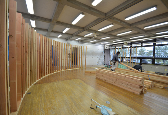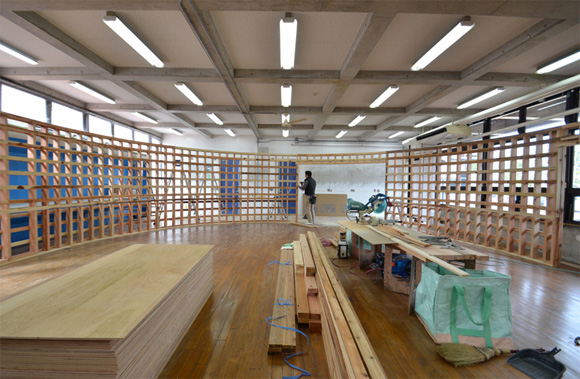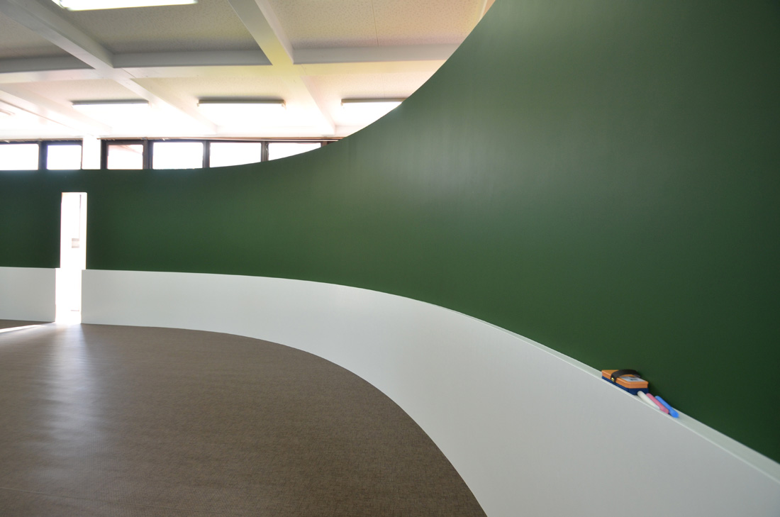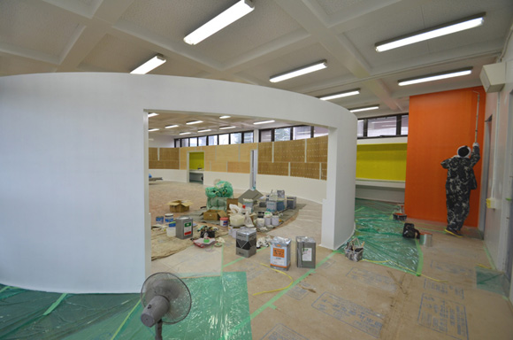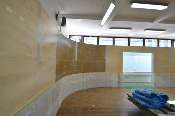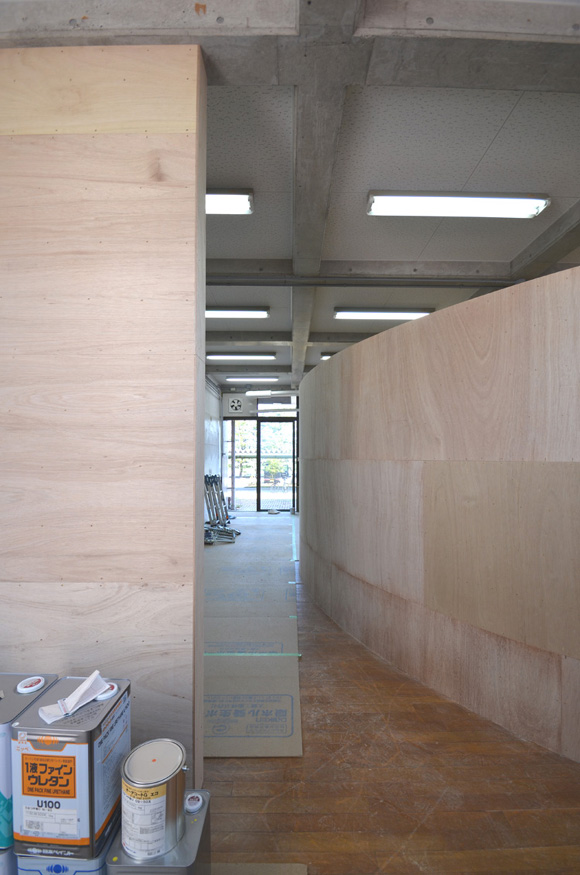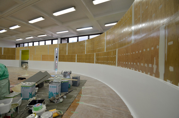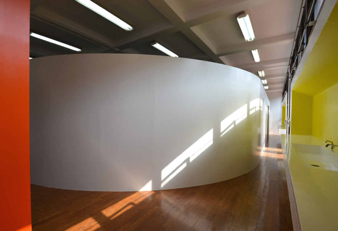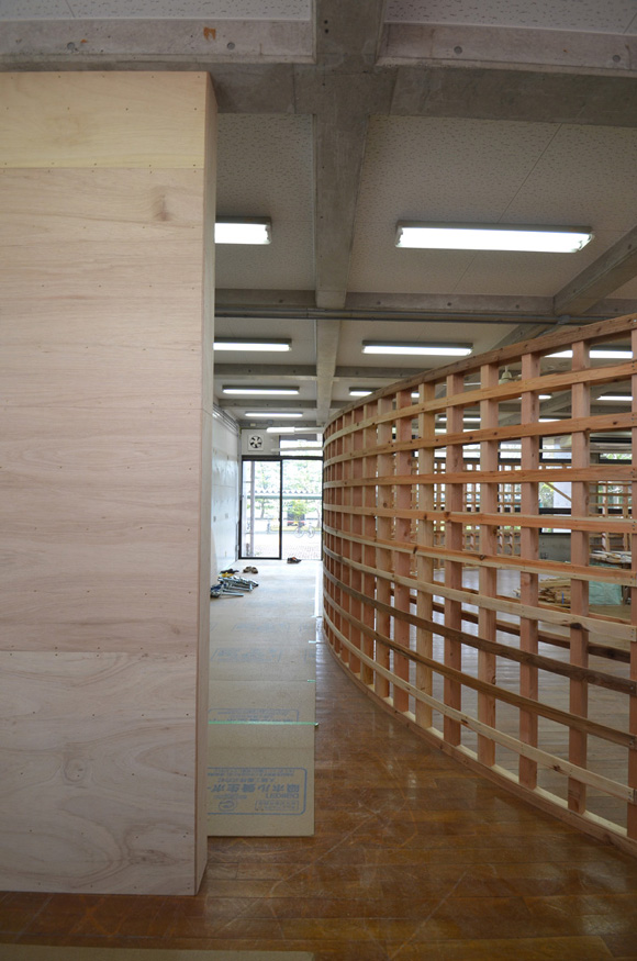 ![]() 2017.3.30 完成 ![]() 曲面壁の緑色部分が黒板になっています。 大小様々な穴から光がこぼれてきます。 ![]() 既存教室に楕円形の壁を挿入。 床には衝撃性、耐水性に強いシートを張りました。 楕円の外側の床材は既存のフローリングです。 ![]() 曲面壁の外側には通路幅分の空きスペースがあります。 ![]() 曲面壁の白い部分は粉受けになっていて粉で床が汚れないよう工夫がされています。 ![]() 粉受けはチョーク置きも兼ねています。 ![]() 元からあった手洗いカウンターも塗装してみました。 ![]() 様々な色が絡みあう教室。色はすべて学校の先生に決めていただきましたー。 ![]() ![]() 間接照明のような光がこぼれてくる。 ![]() 既存のコンクリート壁も白塗装し室内が明るくなるようにしました。 ![]() 配管なども一緒に白塗装。 ![]() 私の字が下手くそなのは気にしないでね。 40周年おめでとうございますm(_ _)m 計画概要 名称:黒板教室 計画内容:教室のリノベーション 計画地:石川県白山市 改修面積:176.40u(53.36坪) 設計期間:2016.12〜2017.1 工事期間:2017.2〜2017.3 撮影:稲森予人 〜ここからは施工中の写真〜 ![]() 2017.3.27 塗装工事が終了し、床シート張りに入りました。 色が絡みあう空間は遊び心があっていいね。 ![]() 耐久性の強い床シート張り中。 ![]() ![]() 2017.3.21 パテ処理を終えて先週の土曜日から塗装がスタートしました。 曲面だと下地がボコボコしたり、パテの跡が見えたりで変になることが多いんだけど、丁寧に仕事してくれたおかげでめっちゃ美しいです。 ここまでキレイになるとは思ってなかったので感動しました。監督さん、大工さん、塗装屋さんのきれいな仕事に感謝ですね! 今週いっぱいかけて塗装工事は終わる予定です。このプロジェクトもあともうちょっと! ![]() 見てくださいな。この美しい曲面壁。 ![]() 2017.3.17 塗装屋さんがひたすらパテ処理をしてくれています。 下地が命のプロジェクトだからね。監督と塗装屋さんに感謝感謝です。 ![]() ![]() ![]() 2017.3.10 一日二度目の現場なう。 自然光が美しい。 ![]() ![]() ![]() 2017.3.10 塗装工事 天井の白塗装も終わり、壁のパテ処理に取り掛かってくれています。 この作業はとてもとても重要。 ![]() 2017.3.4 大工工事 今日から塗装屋さんが入るかも。 このプロジェクトは「色」もかなり使っているので楽しみだなー。 ![]() 粉受け兼チョーク置場製作中。 ![]() 2017.3.2 大工工事 曲げべニアがぐんぐん張られていきます! ![]() ![]() 2017.3.1 大工工事 今日も大工さんが壁はりはり〜。 ![]() ![]() 2017.2.27 大工工事 午後からべニアを張っていくとのこと! 大工さんの仕事が早い!本当は双子なんじゃないのかなー。 ![]() ![]() 2017.2.25 大工工事 大工さんが土曜日でもお仕事がんばってくれています。 おかげ様で下地工事もかなり進んできましたYO。 ![]() ![]() Rが厳しいところは下地材に切り込みを入れて曲げています。 大工さんの努力に感謝です! ![]() 2017.2.24 大工工事 今日も大工さんが下地工事がんばってくれています。 こんな教室なかなかないよね。 ![]() 2017.2.23 大工工事 丸い形の骨組みを大工さんが4日かけて手加工で作ってくれました。 これから楽しみだー。 ![]() ![]() ![]() 2017.2.21 墨出し 大変な仕事だけど頼もしい現場監督に託したので安心。 ![]() ![]() 2017.2.17 現場でクライアントと床のシート、塗装の色など打ち合わせ。 おもしろいことになりそうだ。 ![]() 2017.2.14 壁の高さ、開口の位置、丸のサイズ、色、新旧、素材、塗料。。。 色々なことをぐるぐると考えながらスタディ中。 工期が少ないので急がないとね----┌( ・_・)┘ ![]() ![]() 2017.1.30 工務店さんと現場を確認。これから見積もりに入ります。 よろしくお願いいたします。 ![]() 2017.1.13 初回プレゼン ![]() ![]() 2016.12.20 現地調査 |